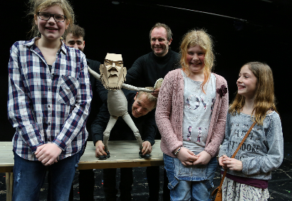Moses ein fantastischer älterer Herr aus Karton und Stoff wird von drei Männern zum Leben erweckt.